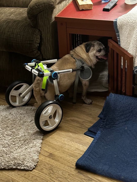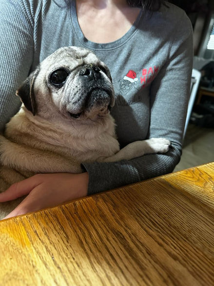 Majority of the time we make the inquiry about an animal if we feel like we can offer them the care they need and deserve. But in Meatloaf’s case, we got the call. Pug Nation reached out to us regarding an old man losing hope. Meatloaf was found on the streets early November 2023 with hind-end weakness, inability to completely relieve himself, unaltered and of course deaf and blind. He made his way to Pug Nation a month later but by the time February rolled around had almost given up all hope. We ran a quick fundraiser and 5 days later welcomed our Meaty Man to Boon. Oh, what a very sad gentleman who was so very lost and confused. He spent a lot of time snapping at us when we got close and quickly became a member of “ The Grumpy Old Men's Society”. The progress was slow to make him comfortable and not scared with every touch but he has made leaps and bounds with trust and has fallen head over heels with Kasey. He can tell instantly when she walks into a room and will not sleep unless he can feel her next to him. It’s incredible to witness the change in this sweet man.